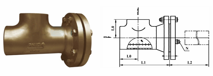 鋁青銅T型過濾器有直流式、正折流式和反折流式三種結構型式。直流式的三通管的左端為進料口,右端為出料口,頂端連接法蘭,法蘭上設有法蘭蓋,橢圓型濾座斜置在三通管的直通管形內部,圓柱型濾芯的下部設有與橢圓型濾座坡度匹配的斜坡,并放置在橢圓型濾座凹槽內固定。正、反折流式的三通管的左端分別為進、出料口,頂端為出、進料口,右端焊有法蘭,并設有法蘭蓋,圓型濾座正置在三通管的直通管形管口處,圓臺型濾芯放置在圓型濾座凹槽內固定。