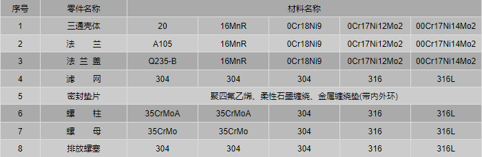 T型直流式過濾器零件材料: