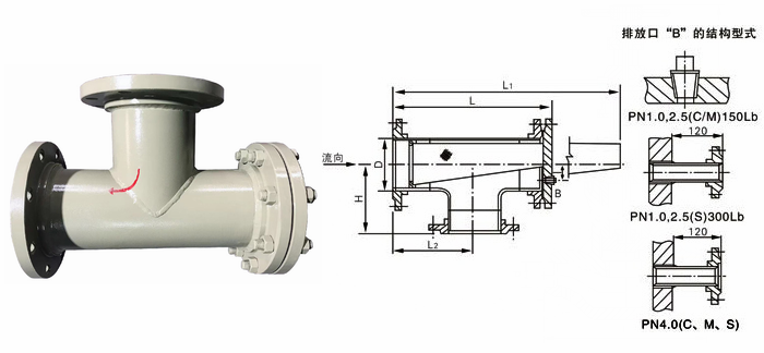 T型正折流式過濾器主要由殼體、法蘭和法蘭蓋、緊固件及過濾網、排污絲堵等零部件組成,其過濾部件濾網安裝在濾筒內,當流體進入置有一定規格濾網的濾筒后,其雜質被阻擋,而清潔的濾液則由T型過濾器出口排出,當需要清洗時,只要將可拆卸的濾筒取出,處理后重新裝入即可,因此,使用維護極為方便。
