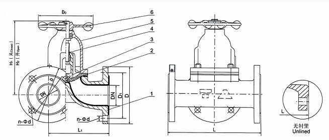 部件列表:1、閥體 2、隔膜 3、閥瓣 4、閥桿 5、閥蓋 6、手輪