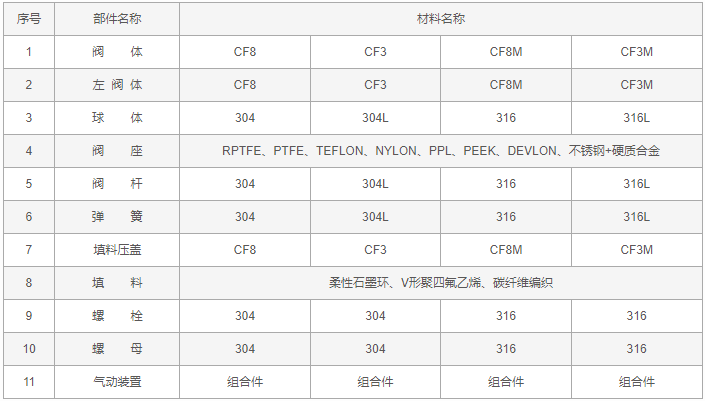 不銹鋼氣動球閥主要零部件全部采用耐酸堿腐蝕性的不銹鋼材料,其球體與閥座密封根據工況不同,可分別采用軟密封、噴焊鎳基合金(硬度大于HRC60)、超音速涂鎢鈷合金(硬度大于HRC70)及其他特種硬化材料等,以適用于各種苛刻工況,該閥軟密封適宜200℃以下工況,硬密封碳鋼不超過425℃,不銹鋼不超過450℃。