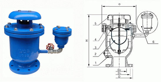 復合式高速進排氣閥是一直由閥體、浮球、大孔密封組件、閥蓋、排氣罩、小孔排氣閥以及檢修閥等主要部件組成的法蘭連接的分分體式排氣閥。其具有當首次供水或因維修處于空管充水時,能快速排盡管內空氣并將水注滿,或在運行中因水中析出的空氣形成壓力氣囊產生氣阻時,小排氣孔將自動開啟排氣,杜絕管中因壓力氣囊阻礙水的流動,有效提高注水或輸水效率。