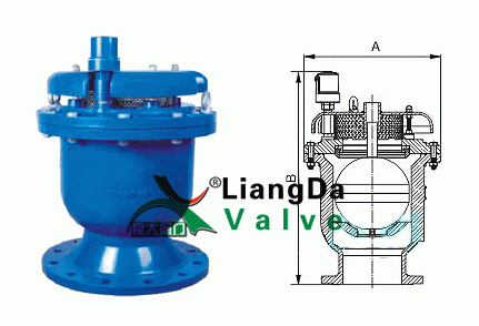 當水進入管路時,塞頭停在定位架下部,進行大量排氣,當空氣排完時,水進入閥門把球浮起,傳動塞頭到關閉,停止排氣。管道在正常運轉時自然會產生少量氣體,這些氣體會聚集到管內上部,到相當程度,閥內水位下降,浮球順水下降氣體從小孔排出,如出現停電、停泵,管道內水流空時隨時會出現負壓,浮球順水下降,打開小孔帶動大孔進行大量進氣確保管道安全。