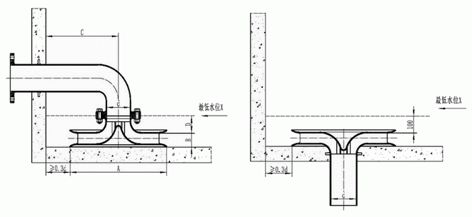 3、安裝要求:旋流防止器的外緣與水池池壁應至少留有0.3d的間隙,d為吸水管到的公稱尺寸。