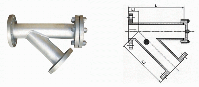 立式Y型過濾器主要由殼體、過濾網、法蘭、法蘭蓋、排污絲堵和密封墊及緊固件等零部件組成,其殼體由主管和斜管按45°或其他銳角焊接制作而成,主管內置有相應過濾面積的濾筒和濾網,其中濾筒的一端放在殼內環形濾網支撐座上,另端則放置在法蘭蓋上,并經螺栓、螺母壓緊固定,通過它可將物料中含有的固體顆粒物分離出來。