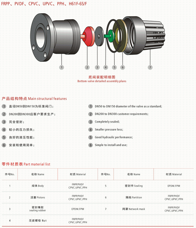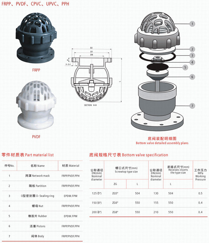 塑料底閥是一種節約能源的閥,一般安裝在水泵水下吸管的底端,限制水泵管內液體返回水源,起著只進不出的功能。閥蓋上有很多個進水口和加強筋,起到了不易堵塞,主要應用在抽水的管路上。水道和支承的作用.口徑有單瓣、雙瓣、多瓣型,有法蘭連接和螺紋連接。塑料底閥由閥體、閥蓋、閥瓣、密封圈和墊片等部件組成。底閥在接入管路后,液體介質從閥蓋方向進入閥體,液體的壓力作用于閥瓣,使得閥瓣被打開允許介質流過,當閥體內的介質壓力變化或消失時,閥瓣關閉阻止介質倒流。塑料底閥零件材質表:
