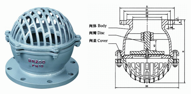 水下式底閥由閥體,閥瓣,閥蓋,襯套,密封圈等零件組成,詳見下圖水源的水從閥蓋進入閥體。在流體的壓力作用下,閥瓣打開水,當示停后出口管內的壓力將閥瓣迅速關閉,液體將不會倒回水源,起到了即暢通抽水又節約水能損失的作用。