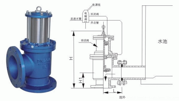 氣動、液動角式排泥閥主要用于自來水公司或污水廠的各類水池,安裝在池外排除池內泥沙。氣動、液動角式排泥閥工作原理及其性能:
