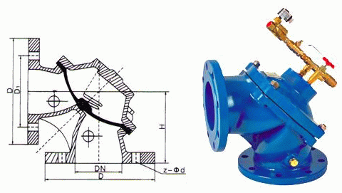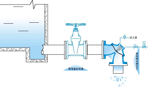 角式隔膜排泥閥內部是由特殊強化的隔膜片、不銹鋼彈簧等組成。具有開啟快,關閉壓力低等優點,經由外部液動(氣動)控制管路,集中控制,啟閉主閥作用等特點。
