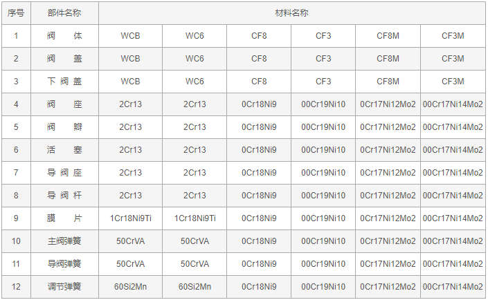 蒸汽減壓閥零件材料: