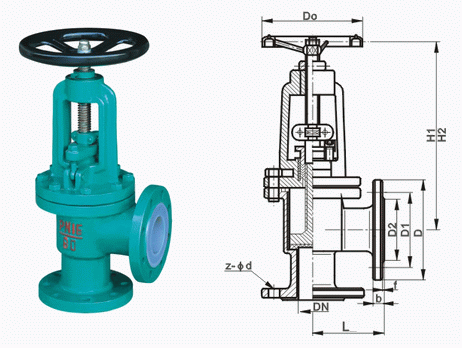 襯氟角式截止閥是指關閉件(閥瓣)由閥桿帶動并沿閥座中心軸線做升降運動的閥門,在管路上主要用來接通或截止斷管路中的介質,但不能做節流用 。襯氟角式截止閥具有結構緊湊、啟閉靈活、耐腐蝕性能強,行程短(一般為公稱通經1/4)等優點。J44F46襯氟角式截止閥適用在-50℃~150℃的各種濃度的王水、硫酸、鹽酸、氫氟酸和各種有機酸、強酸、強氧化劑,FEP還適用于各種濃度的強堿有機溶劑以及其它腐蝕性氣體、液體介質的管路上使用。
