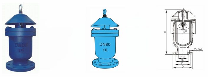 快速排氣閥是由閥體、閥蓋、導向托架、導向套、浮桶、密封蓋、密封墊、防塵罩和排氣嘴等組成,大排氣孔與小排氣孔在同一軸線上,在大排氣孔和浮桶之間設置了一個可上下移動的用不銹鋼材料制造的密封蓋,它既能密封大排氣孔,又具備了小排氣孔的排氣功能。該閥的大排氣孔可與它本身的公稱通徑同一尺寸,流體通路為閥體內腔和導向托架之間的環狀流路,氣體流動性較好,流阻低,排吸氣量大。本產品結構緊湊,重量輕,導向托架上對稱開設數個通氣窗,其排吸氣過程不會產生禍流,提高了排吸氣量。另外,由于密封蓋部件采用不銹鋼材料,上下活動自如,不會產生排吸氣功能失靈現象。