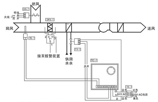 4、當盤管后的溫度低于某限值時,低溫保護開關TS-1切斷送電機的電源,從而使 新風風閥關閉,防止盤管內的水結冰,漲裂盤管。