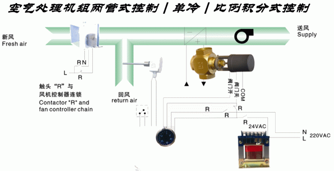 3、冬季制熱:當溫度傳感器檢測到室內溫度低于溫度控制器設定的溫度時,電動調節閥開啟,流量增大,反之,當溫度傳感器檢測到的室內溫度高于溫度控制器設定的溫度時,閥門關閉,流量減小。圖中R觸頭組可與風機連鎖,當風機啟動時新風風門打開,溫度控制器電源被接通,整個系統受控;當切斷風機電源時,風機停轉,新風風門關閉。