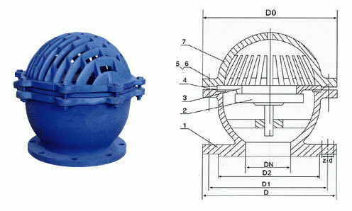 底閥由閥體,閥瓣,閥蓋,襯套,密封圈等零件組成,詳見下圖水源的水從閥蓋進入閥體。在流體的壓力作用下,閥瓣打開水,當示停后出口管內的壓力將閥瓣迅速關閉,液體將不會倒回水源,起到了即暢通抽水又節約水能損失的作用。