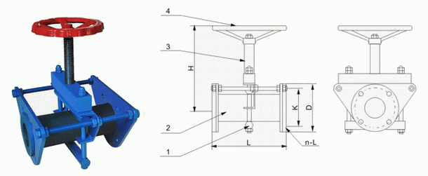 本閥門由閥體、橡膠套管、閥桿、上下壓板、拉桿、手輪等零件組成。