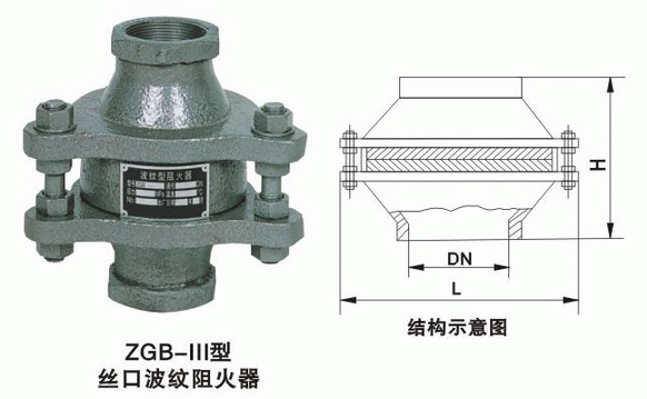 絲口阻火器又名ZGB型絲口阻火器,采用螺紋連接,適用于儲存閃點低于60℃的甲類油品和閃點低于28℃的乙類油品,也適用于儲存物料以氮氣封頂的拱頂罐上,礫石阻火器與網型阻火器原理同上,用在管道上。絲口阻火器可與呼吸閥、呼吸人孔配套使用,也可單獨使用。 阻爆性能合格,連續十三次試驗每次都能阻火。耐火性能合格,耐燒,1小時無回火。