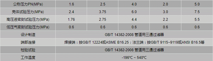 承插焊Y型過濾器主要由主管、斜管、法蘭和法蘭蓋、緊固件及過濾網、排污絲堵等零部件組成,其制造要求、試驗方法及檢驗規則等都是按《管道用三通過濾器》GB/T 14382-2008標準執行,該Y型過濾器是用無縫鋼管由主管和斜管按45度角通過焊接工藝焊制而成的,它通過對焊、承插焊、螺紋、法蘭等方式與管道連接,斜管內置有相應過濾面積和過濾精度的過濾網,本過濾器過濾網一般采用不銹鋼濾筒和絲網雙層結構,以30目/英寸作為標準網,可攔截≥614μm粒徑的固體顆粒,也可根據客戶工況要求定做過濾網。