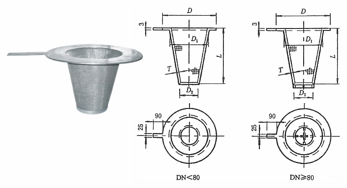 平頂錐形過濾器是一種為過濾石油化工生產過程中液體或氣體介質所含的固體顆粒,從而保證泵正常運行,滿足石油化工企業的安全生產需要而設置在泵入口管道上的臨時性使用的過濾器。其由濾框、濾網及法蘭等構成,濾框由不銹鋼或雙相不銹鋼冷軋鋼板沖制成具有分布均勻孔徑的孔板,并卷成外形為平底錐形狀,小頭一端用圓形沖孔板封底,另一頭焊裝有對夾式法蘭,具有一定目數規格的金屬編織絲網濾網設置在濾框的內表面或外表面上,當流體通過進口端法蘭進入過濾器后,其固體雜質被阻擋,而清潔的濾液卻能穿過濾網流入到管道另一端,進入下一道工序。本產品根據工況的不同一般有兩種流向,安裝在直管段位置時為左右流向,設置在彎頭處時為自上端流入下端。