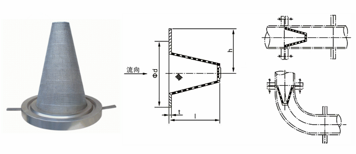法蘭平頂錐形過濾器是一種采用HG/T 21637-1991化工管道過濾器標準設計和制造,安裝在泵、壓縮機的入口或流量儀表前的管道上,用于臨時過濾化工、石油化工、輕工等生產中的液體及氣體物料所含的固體雜質,以保護此類設備或儀表的管道過濾器。其由濾框和濾網等構成,濾框由不銹鋼或雙相鋼冷軋鋼板沖制成具有分布均勻孔徑的孔板,并卷成外形為圓錐臺形狀,上端焊接有法蘭或帶耳板的法蘭環,下端用圓形沖孔板封底,內壁碰焊固定有一定規格的金屬編織絲網,而且濾網目數的選擇主要考慮能滿足工藝過程的需要或對泵、壓縮機等流體輸送機械能起到保護作用的目的。