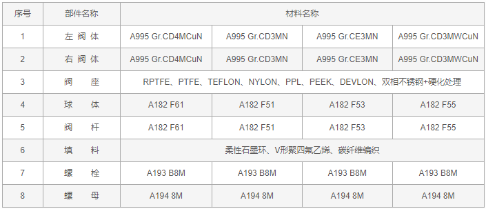 美標雙相鋼球閥是一種主體采用ASTM A995標準中4A(CD3MN)、5A(CE3MN)、6A(CD3MWCuN)、1B(CD4MCuN)或ASTM A182規范中F51(S31803)、F53(S32750)、F55(S32760)、F61(S32550)、F60(S32205)以及SAF系列中SAF2205、SAF2507等雙相鋼材料鑄造或鍛造而成的球閥,該種材質綜合了鐵素體和奧氏體不銹鋼的優點,具有超塑性、高韌性、高強度等特點。在抗腐蝕方面,本產品特適合介質環境比較惡劣(如海水,氯離子含量較高及含硫化物)的條件下使用。