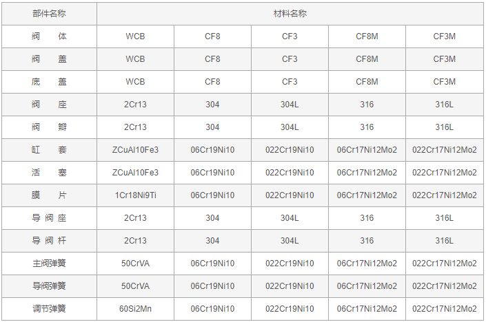 高靈敏度大流量蒸汽減壓閥零件材料: