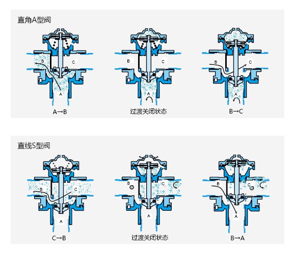 兩位三通閥適用于各種介質過濾器、盤片過濾器和網狀過濾器等的系統配套應用,隔膜驅動的閥塞可以在過濾器單元反洗時,首先關閉進水,然后采用過濾后水對過濾介質或過濾單元進行反沖洗并排走,實現了一閥多用的功能。閥門使用時由來自系統的水壓或氣壓源來控制開閉,通過有至少三個通路的電磁閥、分配器或手動先導閥等來的控制信號實現閥門切換,這樣就有兩種狀態: