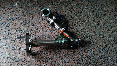 3、卡箍式真空柱塞取樣閥進出口為60度閥,形態如“Y”字。通??煞QY型閥或角閥,也可屬于角閥中的一種特殊閥。此閥通常進口為外絲,出口為內絲。但此閥采用進口法蘭式,出口卡箍連接方式。出口配衛生級球閥及視鏡容器。精小形閥閥柱采用兩段T型槽連接,閥柱螺紋部 與閥柱螺母相配,閥柱螺母靠螺紋旋緊在閥蓋上,然后用銷釘固定。閥桿和手輪連接,然后用螺母壓緊,這樣旋轉手輪就可以開啟或關閉閥門 。